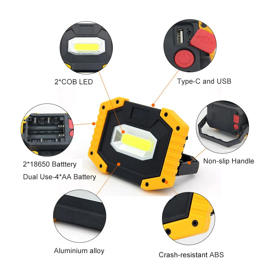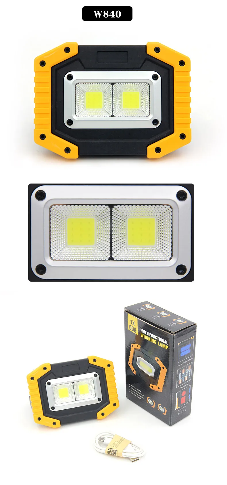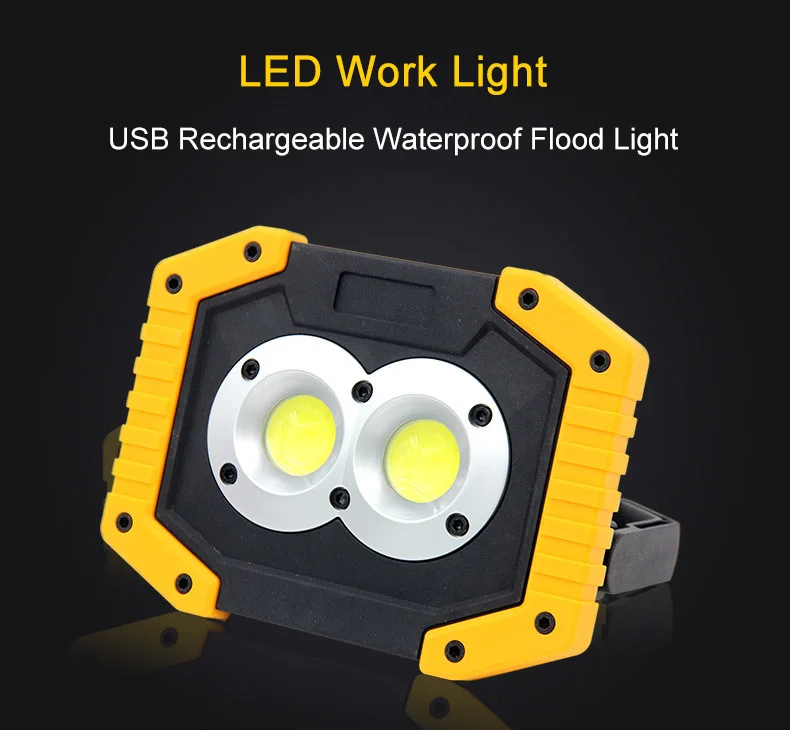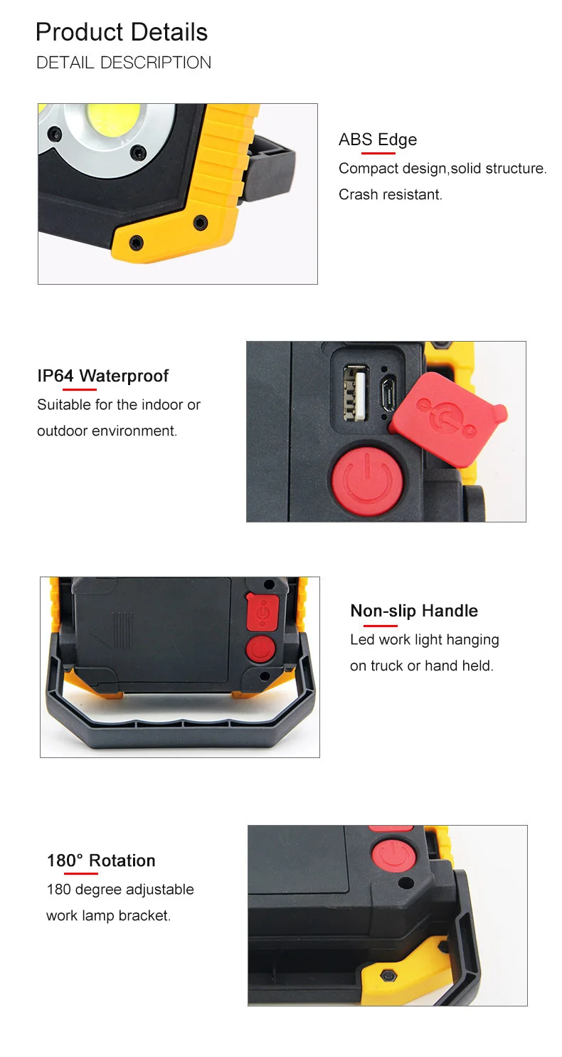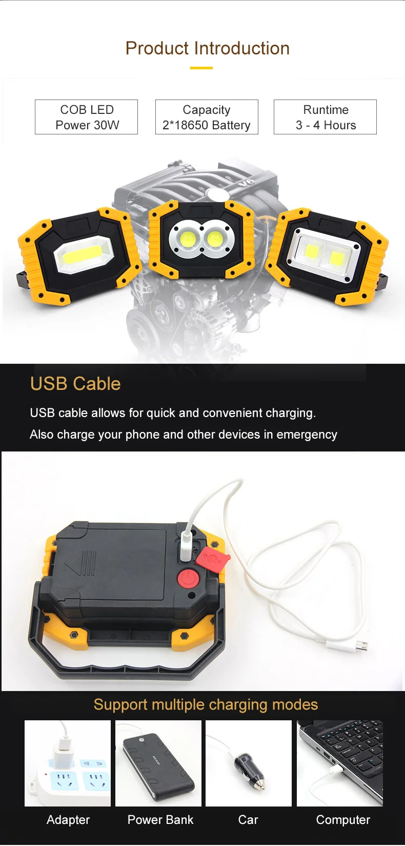【Super Bright & Power Saving】30W handheld portable lighting, 1500 Lumen, replace 200W traditional halogen bulb by 30W COB LED and save 80% on electricity bill of lighting 【3 Modes & Waterproof】Press the switch on button turn on the rechargeable cob work light: High, Low, Strobe Brightness Mode. IP65 Waterproof rating, ensure the led work light rechargeable works fine in rainy days 【LED Work Lights Portable & Flexibility】Because the mechanics light adjustable is cordless. with a 180 degree adjustable lamp stand. So you can put it in anywhere just you like. led work light hanging on truck or hand held. Even on the ground, in the basement, garage or garden at night 【LED Work Light Rechargeable & Battery Powered】Powered by rechargeable batteries(included), equipped a USB cable allows for quick and convenient charging. Also charge your phone and other devices in emergency 【Work Light for Mechanics Widely Used】Camping, Hiking, Fishing, Barbecue, Car Repairing, Truck, Shop, Exploring and more Outdoor Activities