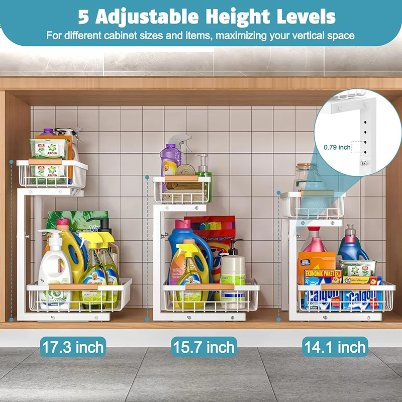 Kitchen Bathroom Metal Sink Storage Shelves Height Adjustable Pull Out Cabinet Organizer 2-tier Under Sink Slide Out Organizer