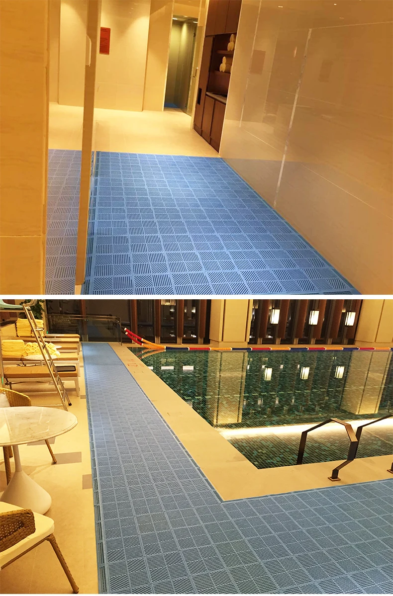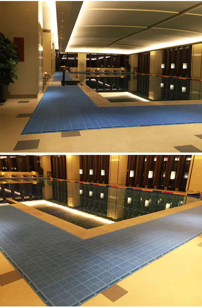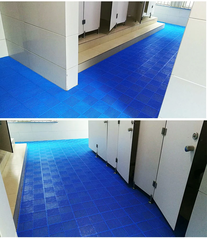 Modular interlock design, can be arbitrary combination,easy installation, hydrophobic,and skid resistant,comfortable foot feel.It is made of environmentally friendly PVC material with acid and alkali resistance and cold resisanace.It can be applied to bathroom,swimming pool and so on.
