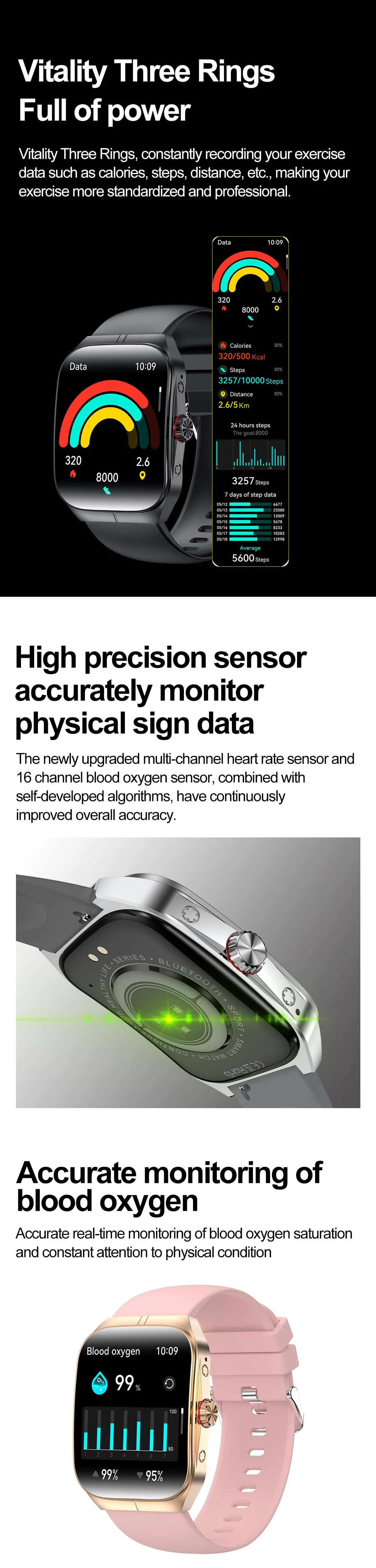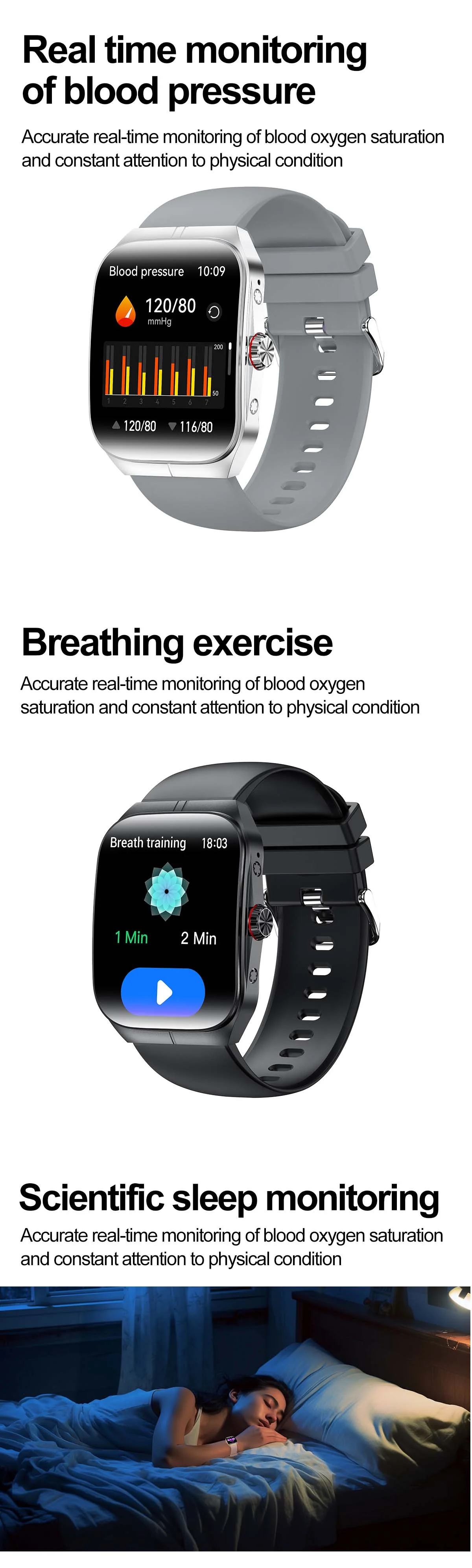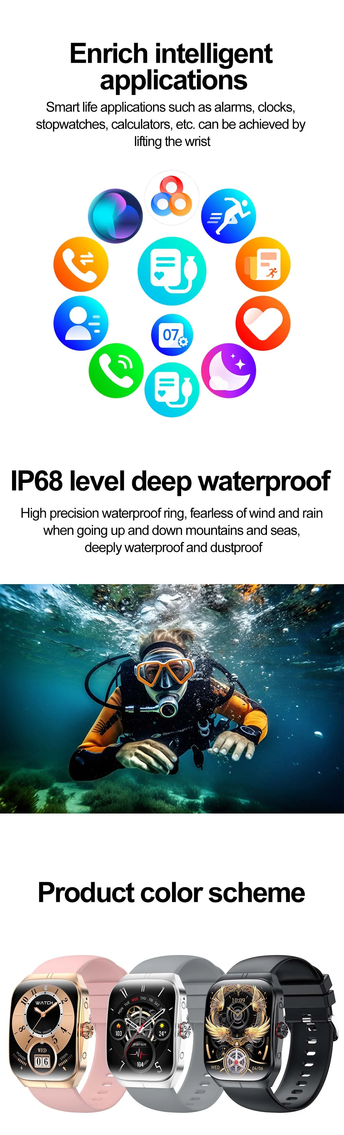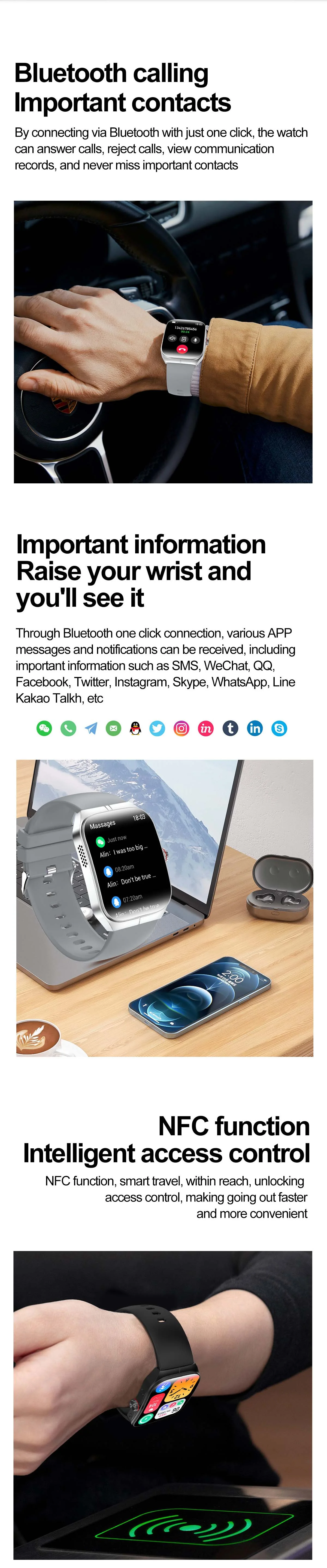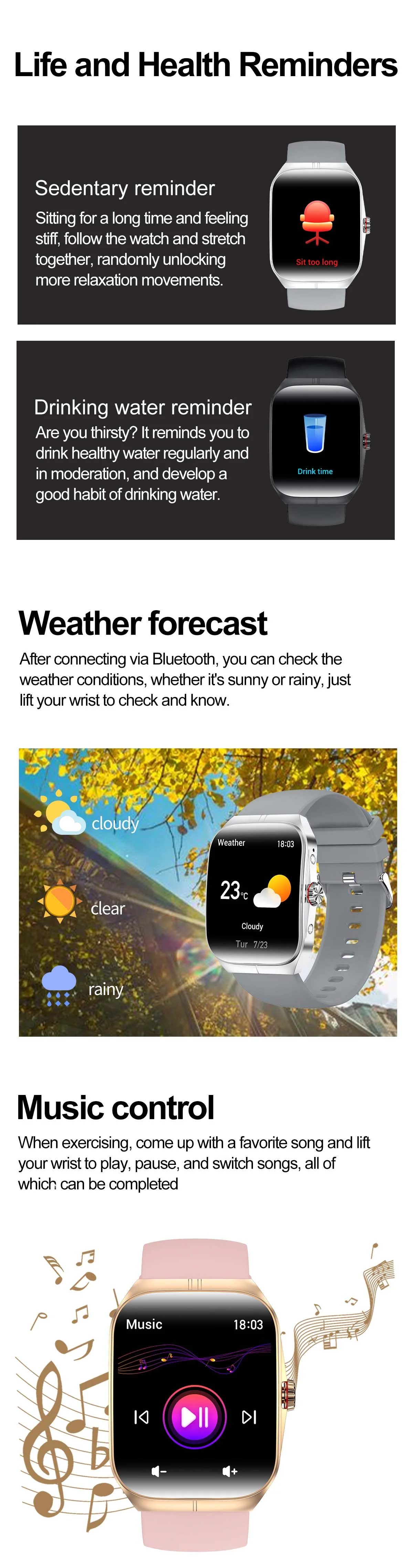 function: Calendar, Alarm Clock, Sleep Tracker, Fitness Tracker, Call Reminder, Answer Call, Dial Call, Heart Rate Tracker, Activity Tracker, Social Media Notifications, Calorie Tracker, Breath Monitor, Distance Tracker, EMAIL, Multisport Tracker, Music Player, Sedentary Reminder, WORLD TIME, Calculators