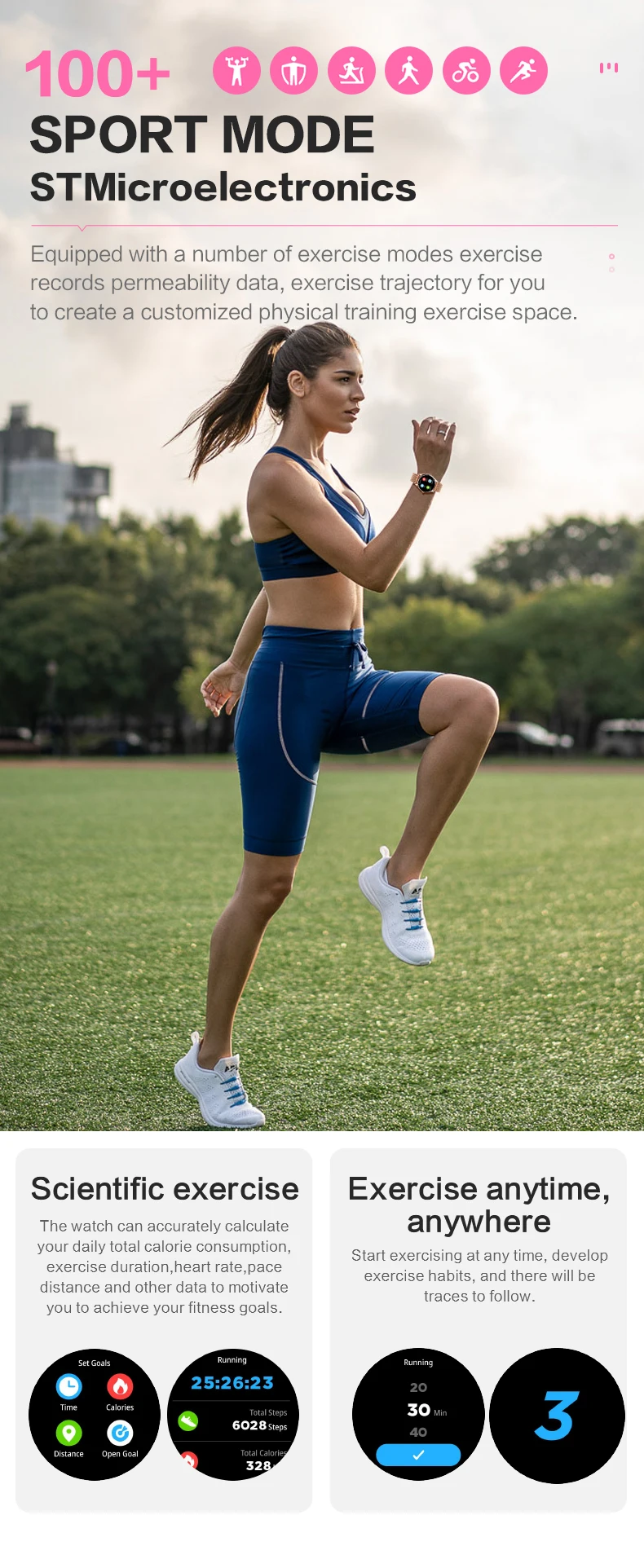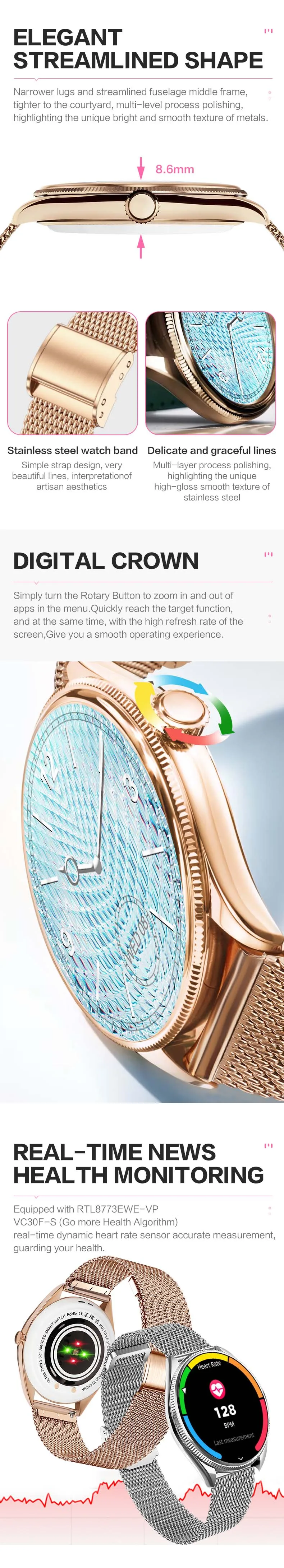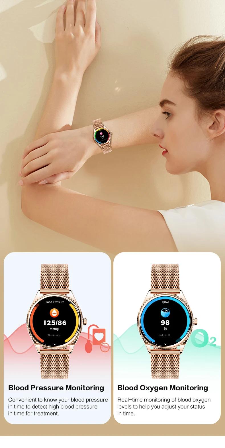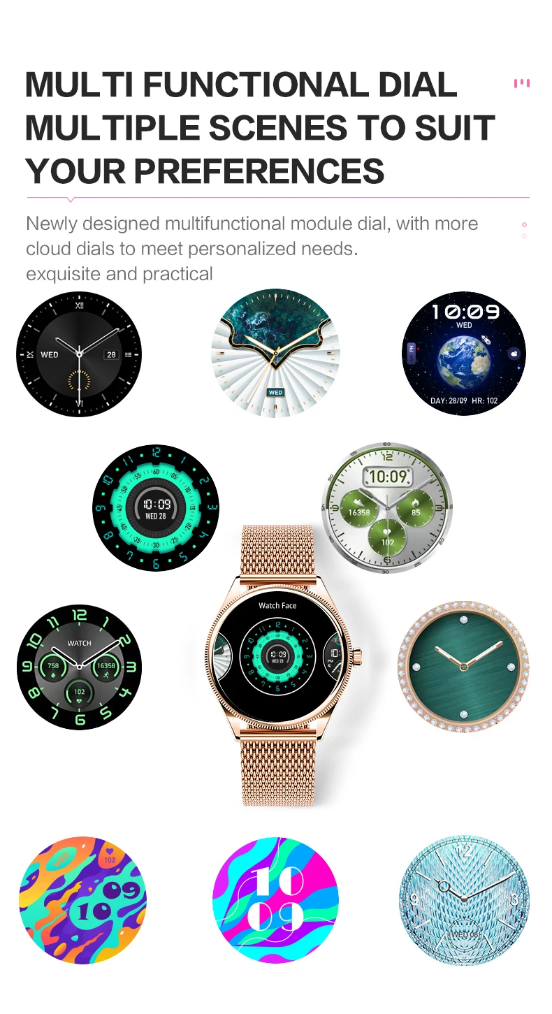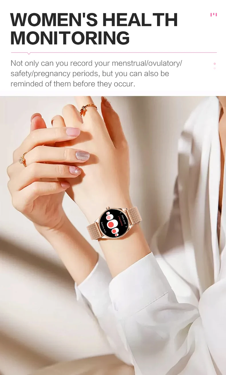 | Major Function | Activity Sleep Monitoring 24-Hour Heart Rate Monitoring (Live Body Tracking) Phone Call(Recent Call Dial Pad Contacts Answer Call) Exercise Multiple Sports Modes(Support 123 Sports) Blood Pressure Monitoring Spo2 Monitoring Stree Monitoring Messasge Shutter Music Player Relaxation AI Voice Timer Alarm Stopwatch Cycle tracking Flashlight Find Phone Calculator Games World Clock,DND Mode Passcode Lock Screen Clock(Analog clock/Digital clock) |
