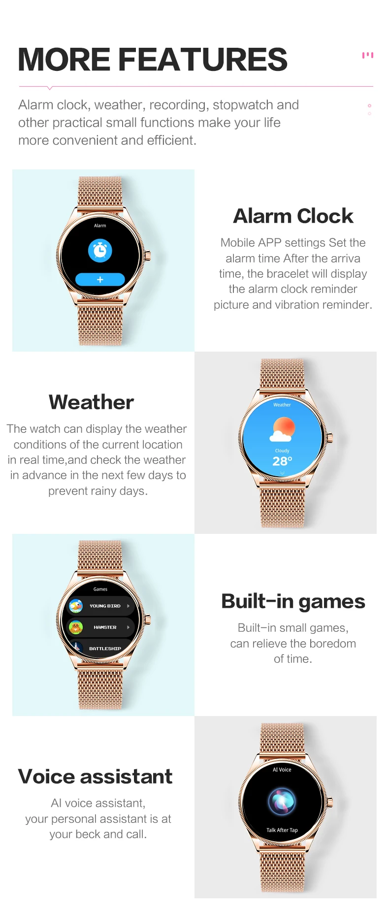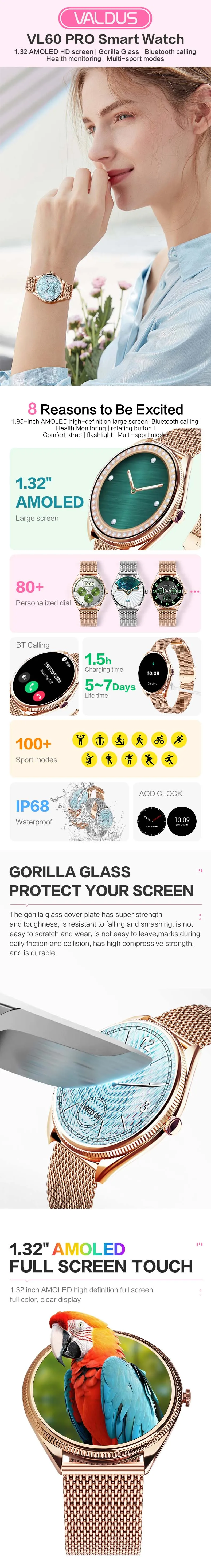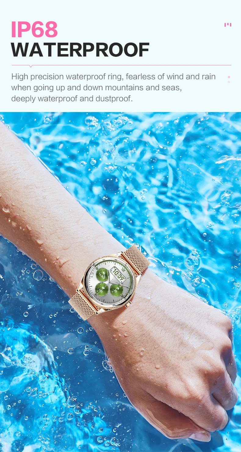 feature: Touch Screen, SDK available, Dustproof, Anti-Impact, Anti-fluid corrosion, Bluetooth function: chronograph, Calendar, Alarm Clock, Sleep Tracker, Fitness Tracker, Call Reminder, Answer Call, Push Message, Message Reminder, Dial Call, Heart Rate Tracker, Activity Tracker, Social Media Notifications, Calorie Tracker, Breath Monitor, Distance Tracker, Multisport Tracker, Music Player, Sedentary Reminder, Menstrual Management, AI voice assistant, WORLD TIME, Calculators
