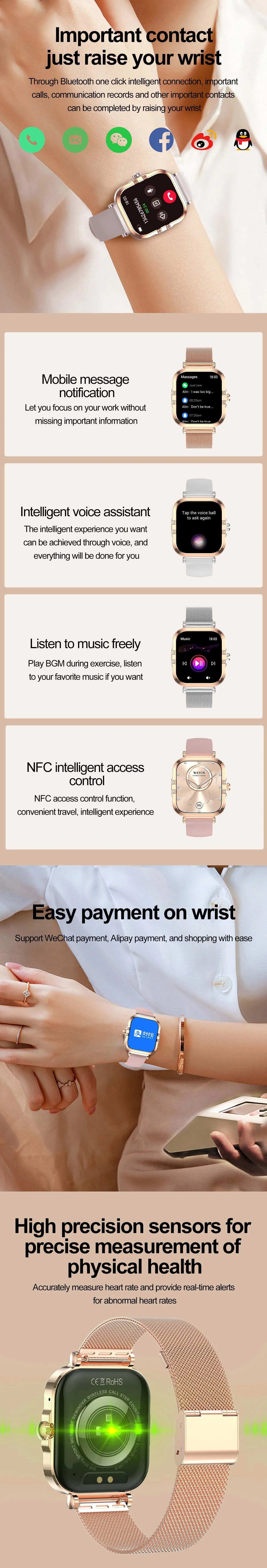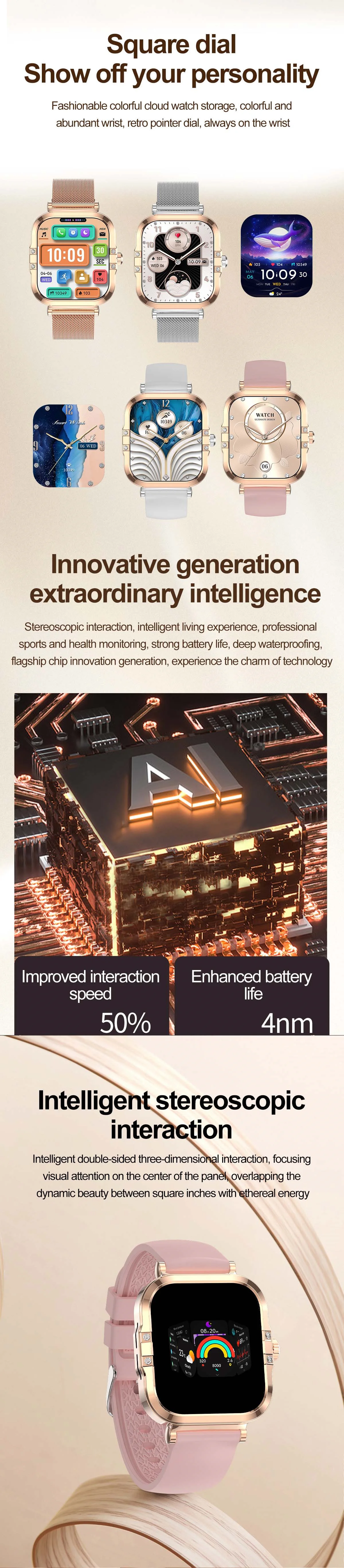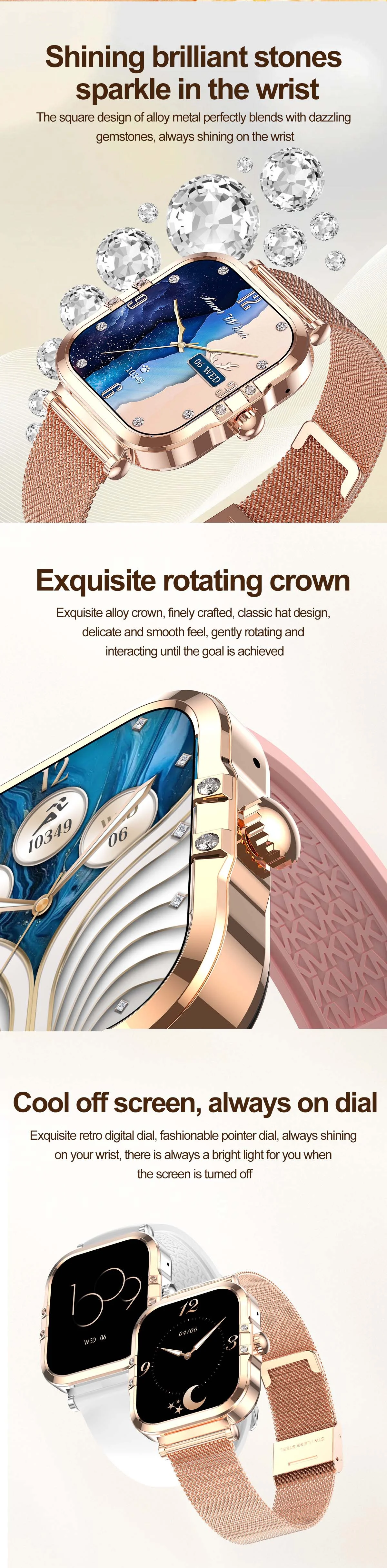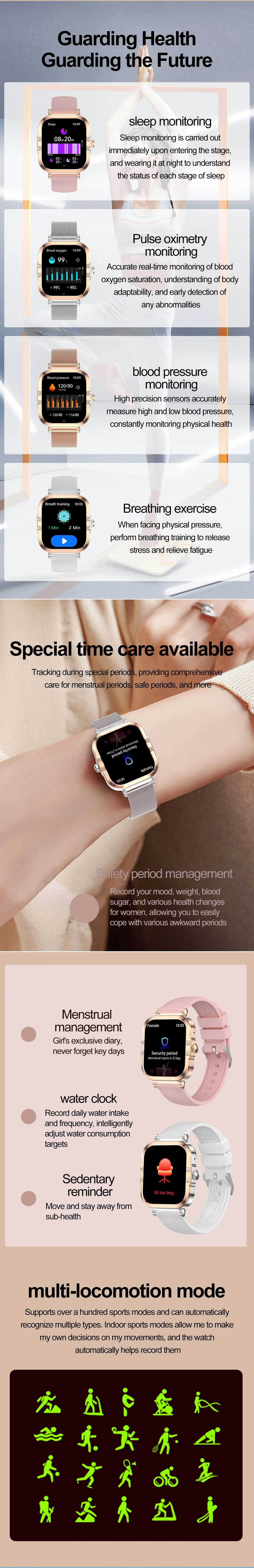 function: Calendar, Alarm Clock, Sleep Tracker, Fitness Tracker, Call Reminder, Answer Call, Message Reminder, Heart Rate Tracker, Payment, Activity Tracker, Social Media Notifications, Calorie Tracker, Breath Monitor, Distance Tracker, EMAIL, Multisport Tracker, Music Player, Sedentary Reminder, SOS button, Menstrual Management, AI voice assistant, WORLD TIME, Calculators