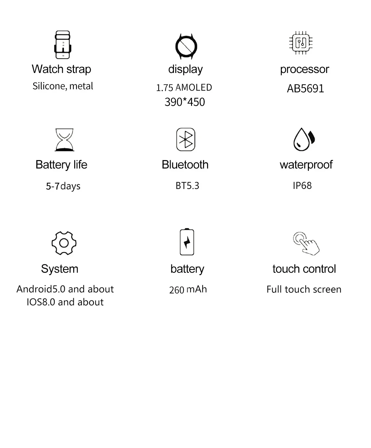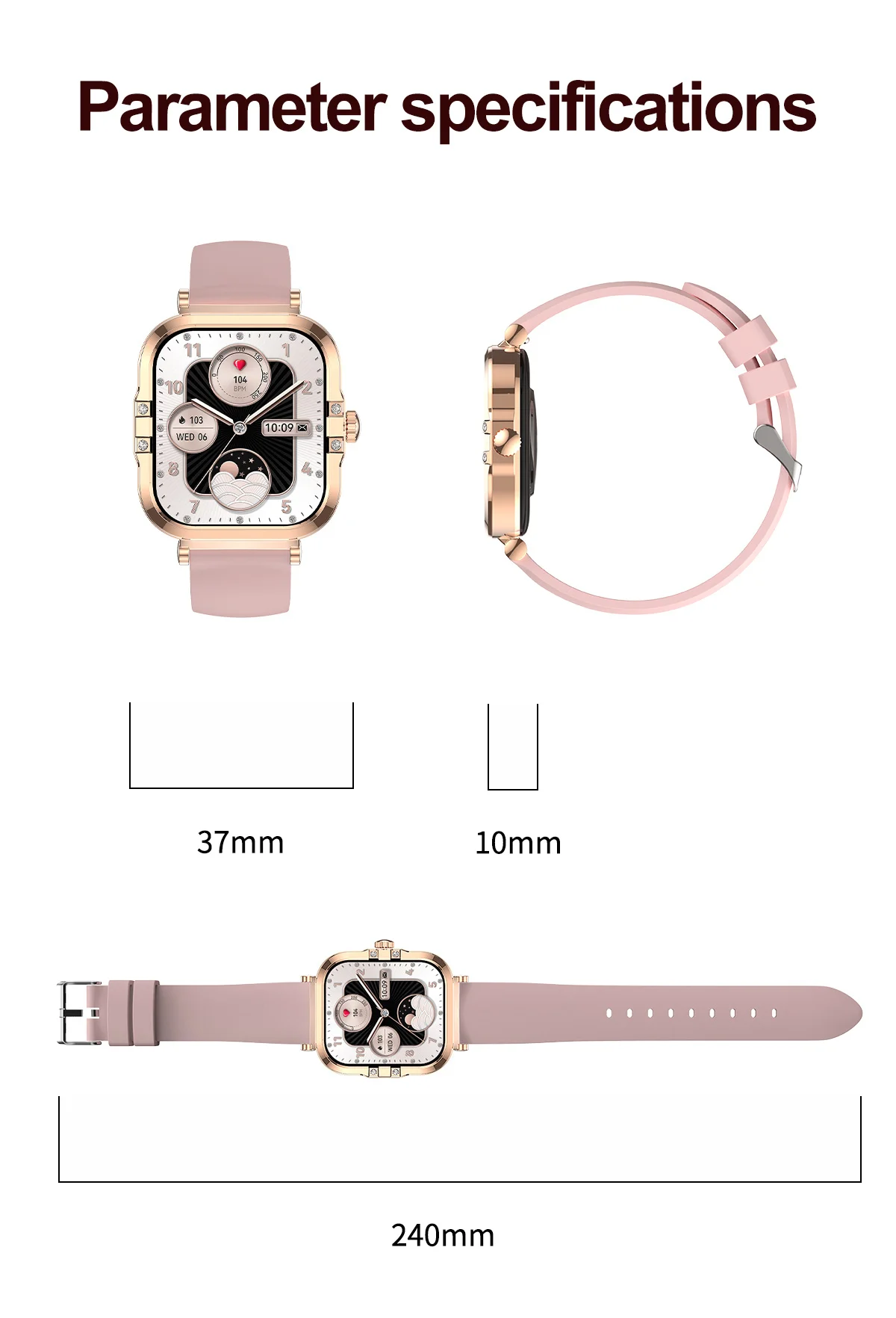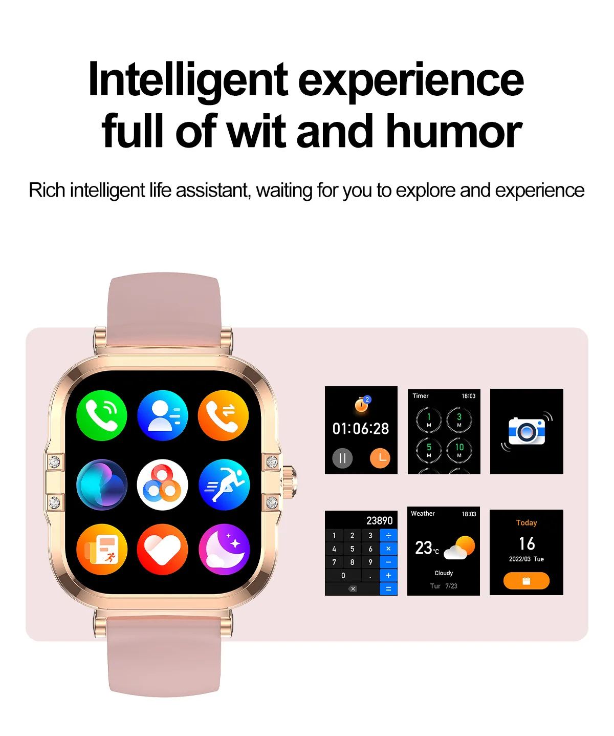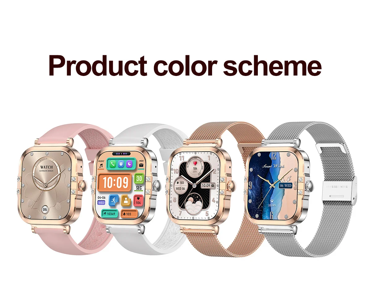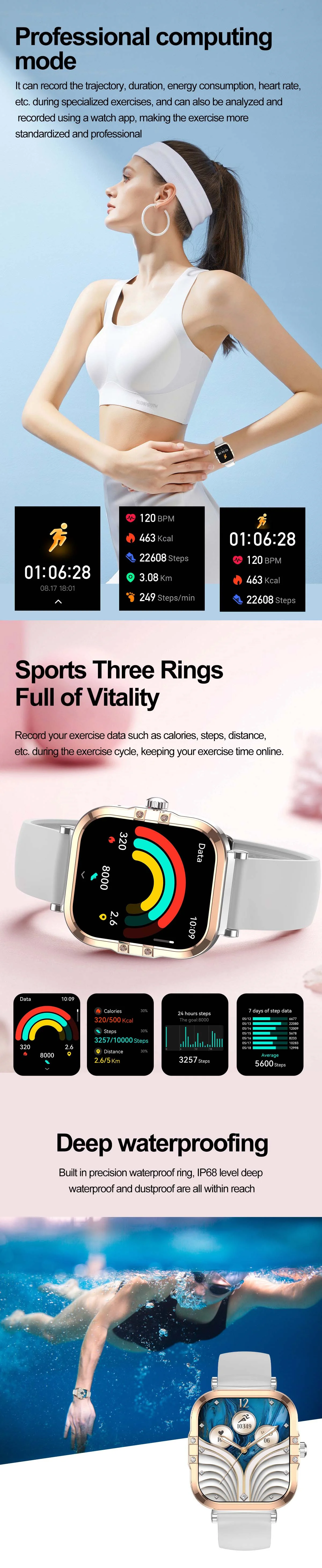 function: Calendar, Alarm Clock, Sleep Tracker, Fitness Tracker, Call Reminder, Answer Call, Message Reminder, Heart Rate Tracker, Payment, Activity Tracker, Social Media Notifications, Calorie Tracker, Breath Monitor, Distance Tracker, EMAIL, Multisport Tracker, Music Player, Sedentary Reminder, SOS button, Menstrual Management, AI voice assistant, WORLD TIME, Calculators