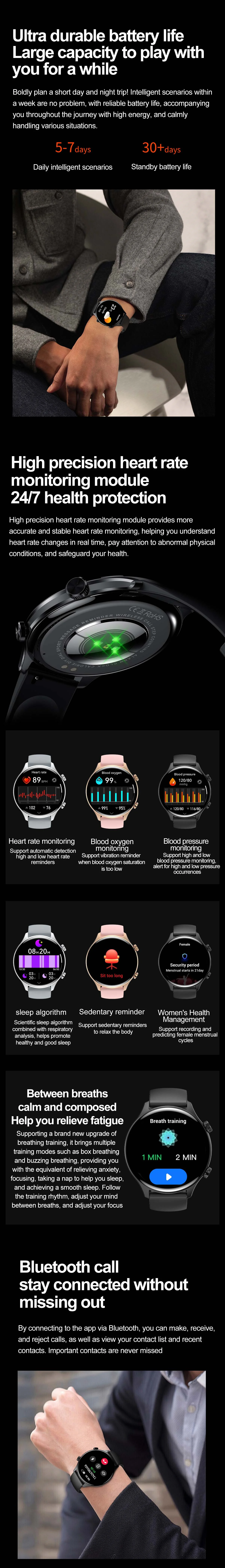 function: Calendar, Alarm Clock, Sleep Tracker, Fitness Tracker, Call Reminder, Answer Call, Message Reminder, Heart Rate Tracker, Payment, Activity Tracker, Social Media Notifications, Calorie Tracker, Breath Monitor, Distance Tracker, EMAIL, Multisport Tracker, Music Player, Sedentary Reminder, AI voice assistant, WORLD TIME, Calculators