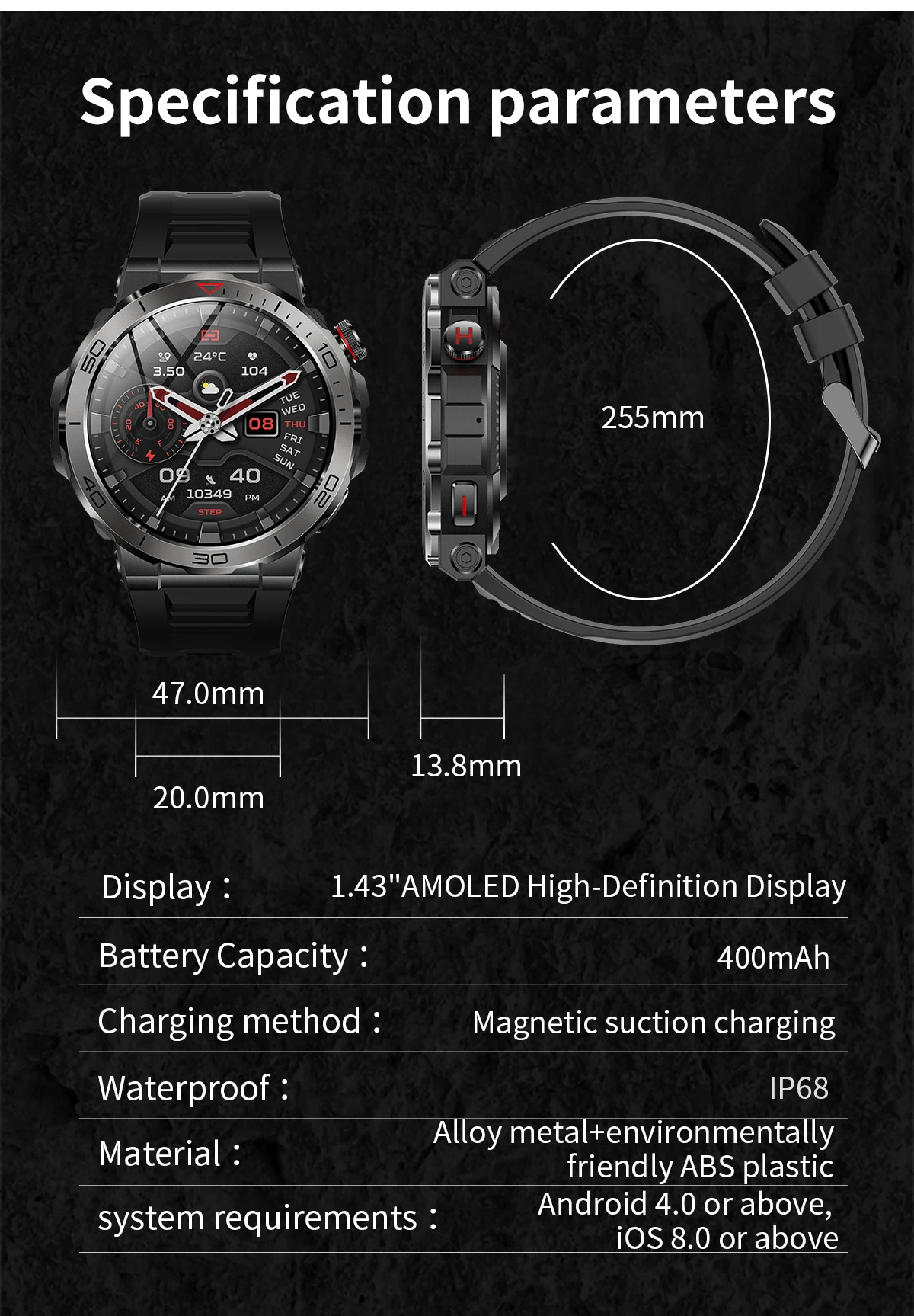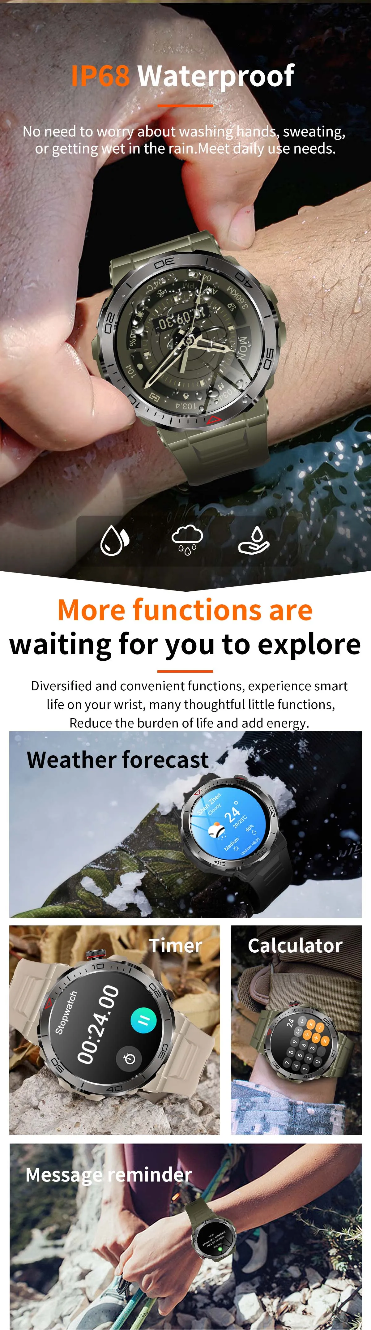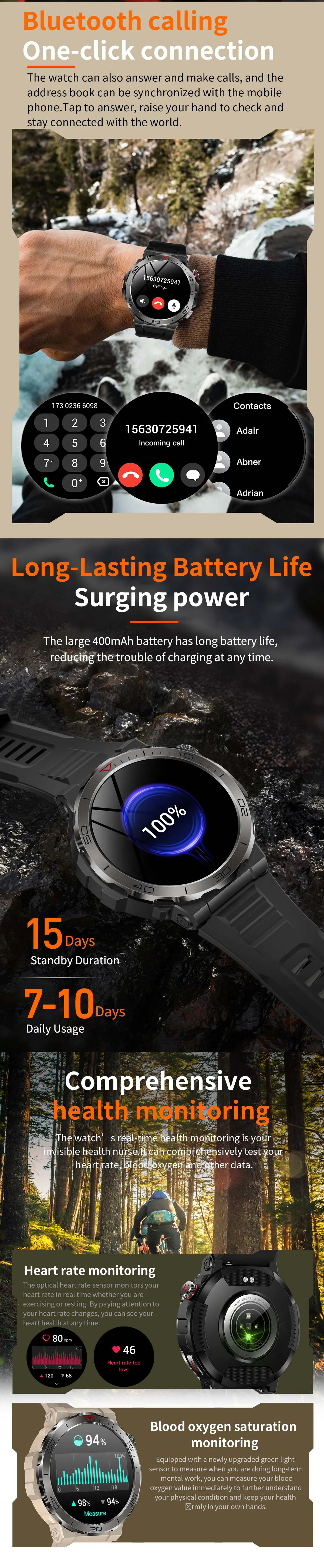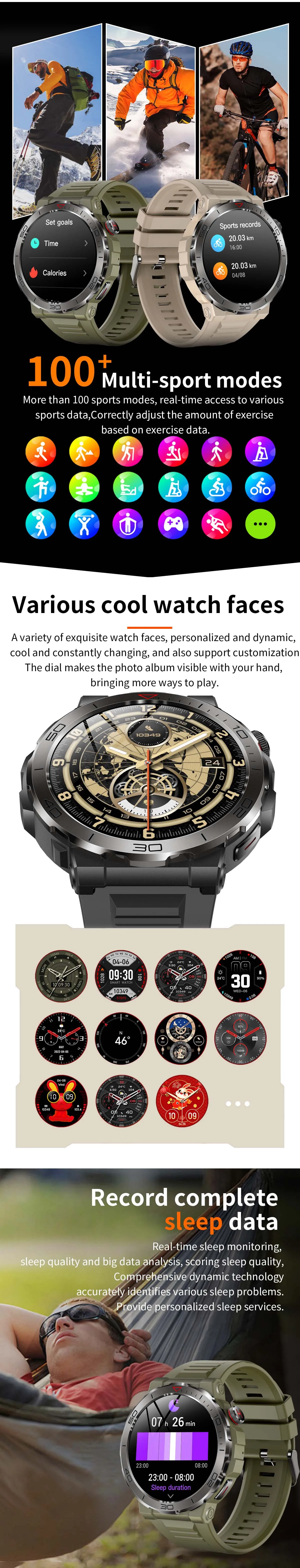 function: chronograph, COMPASS, Alarm Clock, Noctilucent, Sleep Tracker, Fitness Tracker, Call Reminder, Answer Call, Message Reminder, Heart Rate Tracker, Activity Tracker, Social Media Notifications, Calorie Tracker, Breath Monitor, Distance Tracker, Multisport Tracker, Music Player, Sedentary Reminder, Menstrual Management, AI voice assistant, WORLD TIME, Calculators