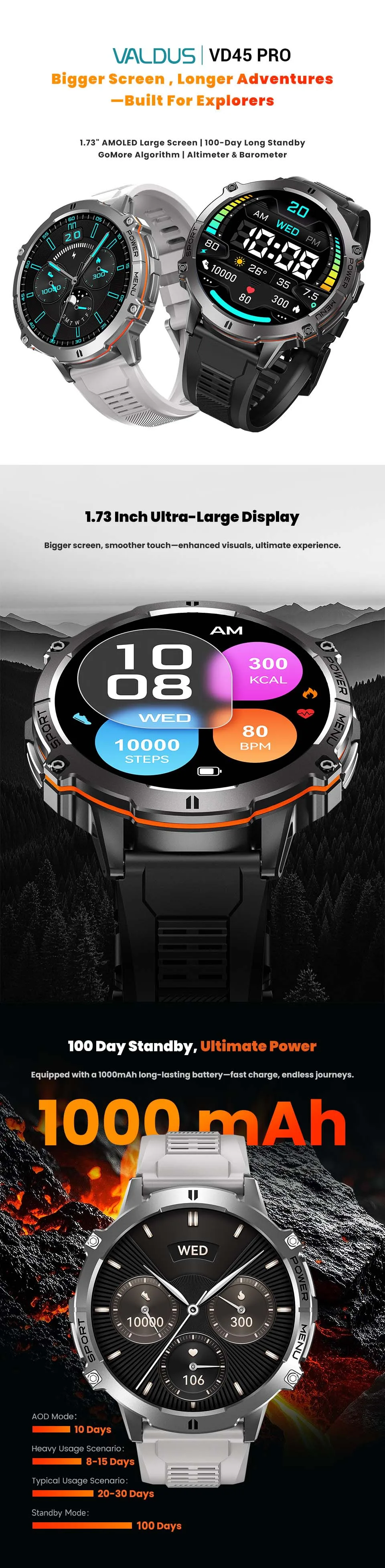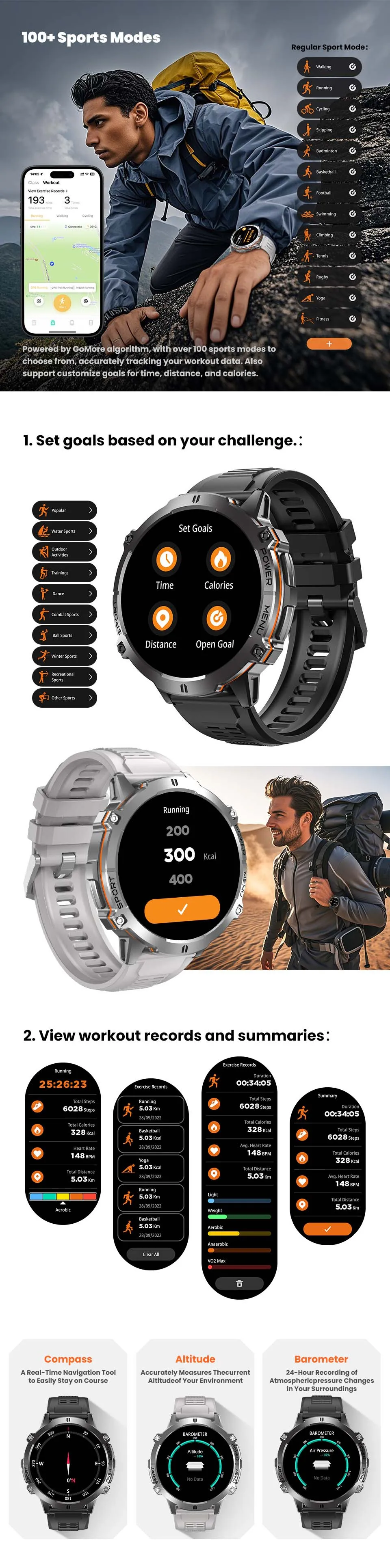 | RBasic Functions | Data (Step Counting Calories Distance) Sleep Detection Heart Rate Detection Sports Mode (100+ Types) Sports Records Blood Oxygen Detection Stress Detection Weather Bluetooth Calls (Dialing Contacts Common Contacts Call Records) Message Music Control Breathing Training World Clock Voice Assistant Timer Alarm Clock Stopwatch Womens Health Find Phone Calculator Do Not Disturb Mode Power Saving Mode Flip Wrist To Wake Up The Screen Brightness Adjustment Screen On Time AOD Sound &Vibration Dial Switching Menu Style Compass Barometer (Air Pressure Altitude) Time Setting Sports Recognition Down Button Setting Cover Lock Lock Screen When Leaving Wrist Password SOS Emergency Call System (Restart Shutdown Factory Reset) |