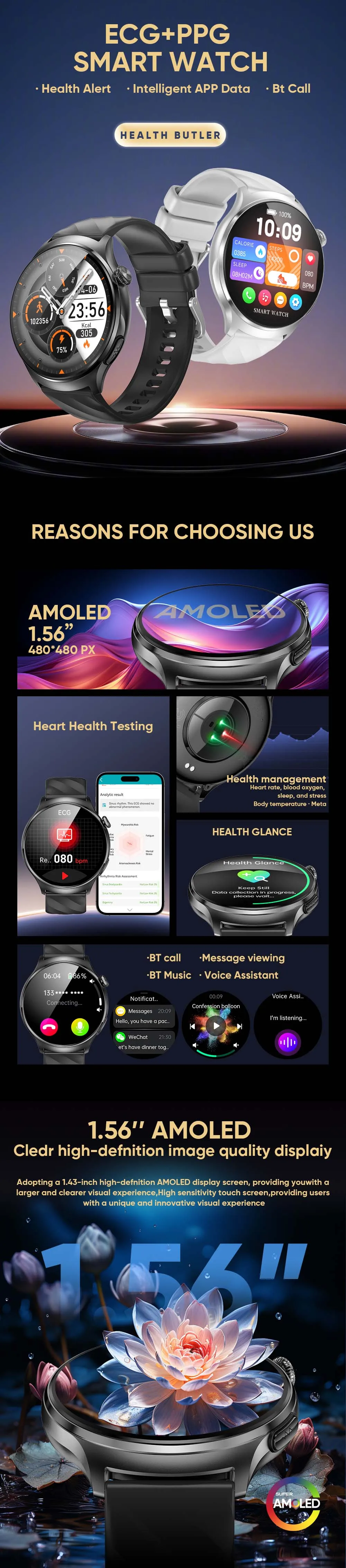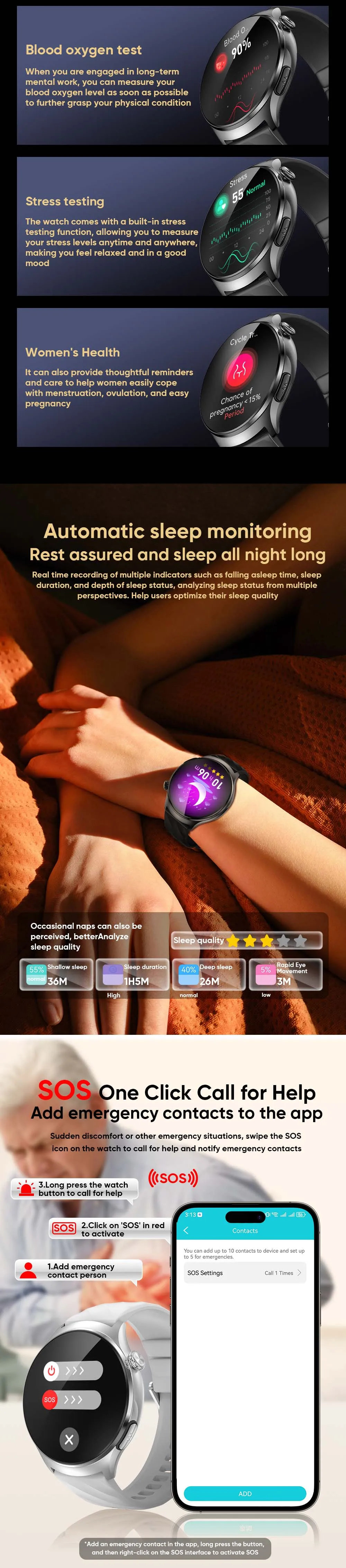 2 ECG+PPG (Electrode+Photoelectric) Testing For Heart Rate(Generate ECG Report HRV Report ECG Playback) 3 Dual Mode Bluetooth Call Intelligent Voice Assistant 4 Body Temperature Sleep Heart Rate Blood Pressure Health Monitoring |