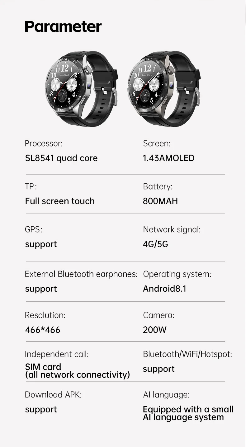 function: chronograph, COMPASS, Calendar, Alarm Clock, Countdown, Noctilucent, Sleep Tracker, Fitness Tracker, Call Reminder, Answer Call, Push Message, Mood Tracker, Message Reminder, Dial Call, Heart Rate Tracker, Gps Navigation, Payment, Activity Tracker, Social Media Notifications, Calorie Tracker, Distance Tracker, Multisport Tracker, Music Player, Sedentary Reminder, SOS button, Video Call, AI voice assistant, Calculators