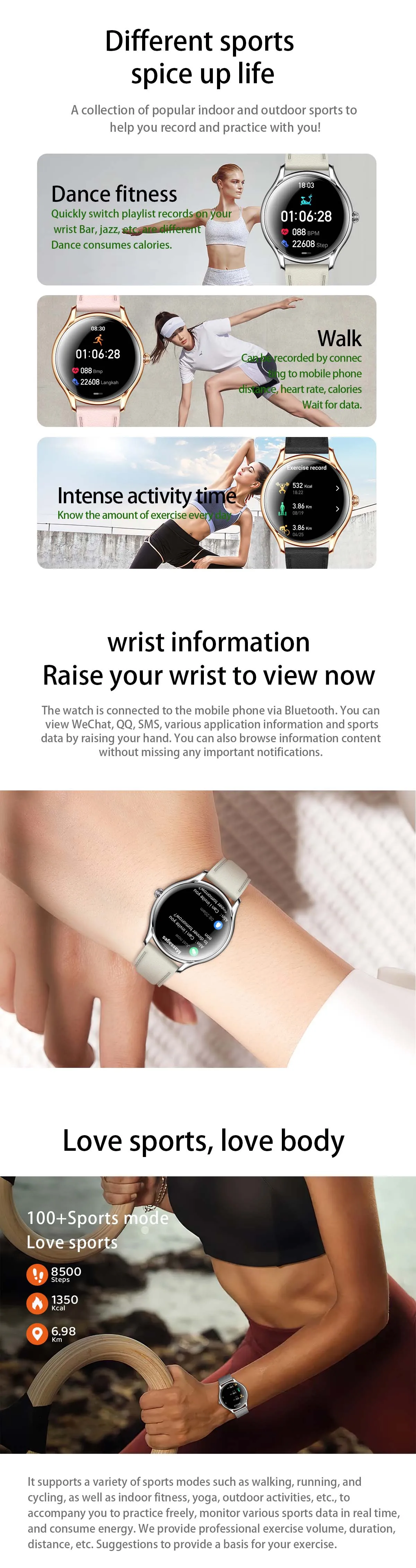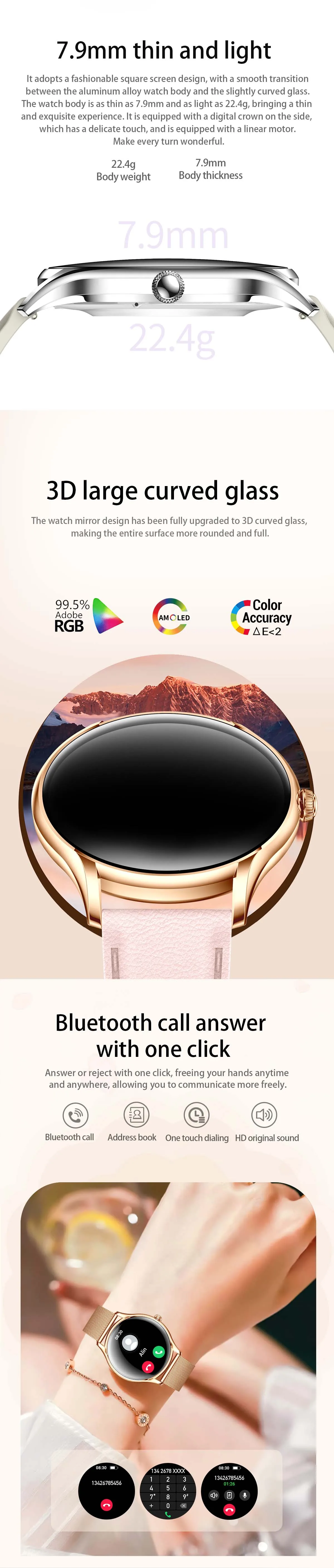 function: Alarm Clock, Countdown, Sleep Tracker, Fitness Tracker, Call Reminder, Answer Call, Message Reminder, Dial Call, Heart Rate Tracker, Activity Tracker, Social Media Notifications, Calorie Tracker, Breath Monitor, Distance Tracker, Music Player, Sedentary Reminder, Menstrual Management, WORLD TIME, Calculators